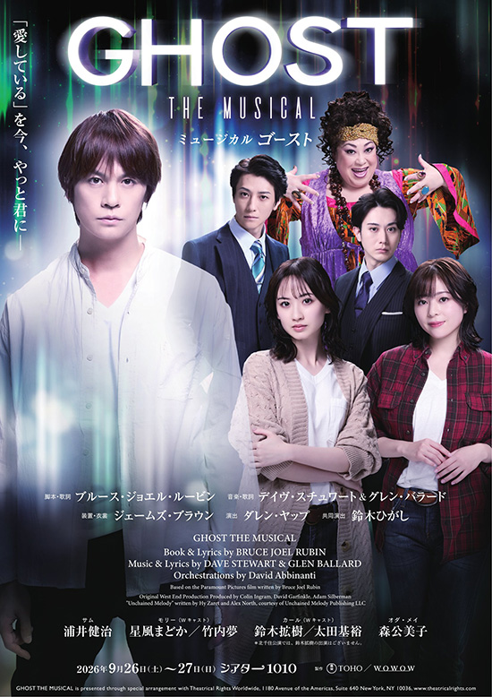 2018年、日本オリジナル演出版として日本初演され、心の中まで響き渡る数々のナンバーに載せて、生死を越えた儚くも確かな変わらない愛の形を描き出し、東京をはじめ全国に多くの感動の涙を届け、早くも2021年に再演されました。そして5年の時を経て、多くのご要望にお応えし、再びシアタークリエ、そして全国の舞台へと蘇ります。主演のサム役には、その高い歌唱力と繊細且つ濃密な演技で日本ミュージカル界を牽引する浦井健治が初演再演から続投。映画版はデミ・ムーアが演じたサムの恋人モリー役には、Wキャストとして、宝塚歌劇団退団後、数々のミュージカル作品でその可憐な魅力と抜群の歌唱力を発揮し続ける星風まどかと、NHK Eテレ「おとうさんといっしょ」で、うたのおねえさんとしてレギュラー出演中、子供から大人まで幅広い年齢層から支持を得ている竹内夢が、初参加。敵役となるサムの親友カール役もWキャストとして、ミュージカル『SPY×FAMILY』初演では主演のロイド・フォージャー役を演じ切り、舞台を中心に精力的な活動を続ける鈴木拡樹と、ミュージカル『十二国記』の楽俊役で、その実力を遺憾なく発揮した記憶も新しい太田基裕が初参加となる。そして、映画版でウーピー・ゴールドバーグがコミカルに演じた霊媒師のオダ・メイ役には、ミュージカル『天使にラブ・ソングを~シスター・アクト~』でもその魅力を発揮する森公美子が初演再演に引き続き、盤石のウーピー節を炸裂させます。
